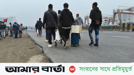 মাথায় মালামাল নিয়ে হাঁটতে থাকা ফিরোজ বলেন, নরসিংদী যাব কিন্তু কোনো বাস খুঁজে পাচ্ছি না। বিমানবন্দরের সামনে দেখলাম সব বাস রিজার্ভ করা। আপাতত হেঁটে সামনে যাচ্ছি। দেখি কোনো ব্যবস্থা করতে পারি কিনা। ভোগান্তি তো হচ্ছেই, না হলে তো আর মালামাল মাথায় নিয়ে যেতে হতো না।