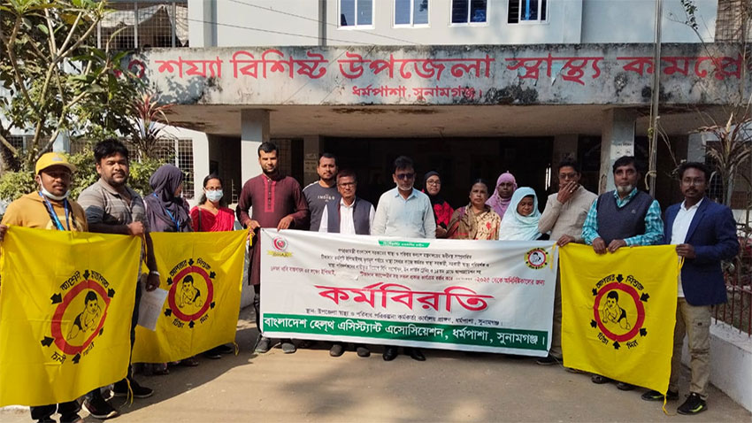 ছয় দফা দাবিতে ধর্মপাশায় স্বাস্থ্য সহকারীদের অবস্থান কর্মসূচি ও কর্মবিরতি