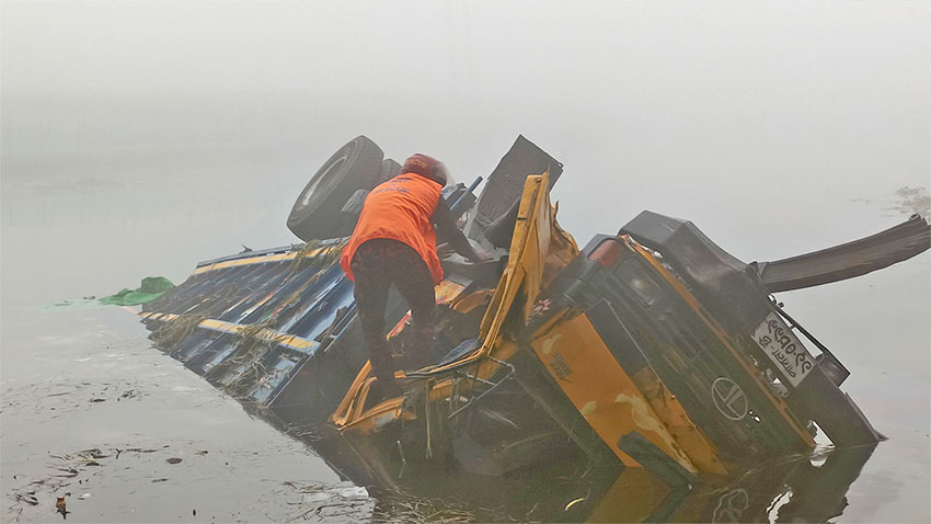 ঝিনাইদহের শৈলকুপায় একটি ট্রাক নিয়ন্ত্রণ হারিয়ে সেতুর রেলিং ভেঙে নদীতে পড়ে যাওয়ার ঘটনা ঘটেছে। এতে ফায়ার সার্ভিস দুইজনের মরদেহ উদ্ধার করেছে। শনিবার (৩ জানুয়ারি) দিবাগত রাত ১টার দিকে ঝিনাইদহ-কুষ্টিয়া মহাসড়কের গাড়াগঞ্জ এলাকার বড়দাহ পুরাতন সেতুতে এ দুর্ঘটনা ঘটে।