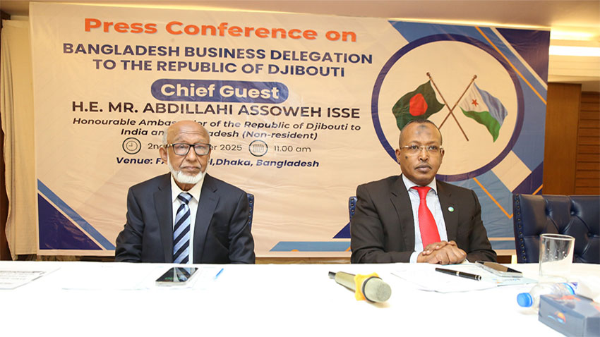 মঙ্গলবার (২ ডিসেম্বর) রাজধানীর একটি হোটেলে আয়োজিত এক সংবাদ সম্মেলনে তিনি এই আহ্বান জানান। রাষ্ট্রদূত আগামী জানুয়ারি মাসে বাংলাদেশের একটি ব্যবসায়ী প্রতিনিধিদলের জিবুতি সফর বিষয়েও বক্তব্য রাখেন। এ সময় উপস্থিত ছিলেন বাংলাদেশে জিবুতির অনারারি কনসাল ও বারভিডার সভাপতি আবদুল হকসহ আরও অনেকে। বাংলাদেশের তৈরি পোশাক খাত, টেক্সটাইল, ইলেকট্রনিক্স, ওষধ এবং খাদ্য প্রক্রিয়াকরণ শিল্প খাতের ব্যবসায়ী নেতৃবৃন্দ উপস্থিত ছিলেন।