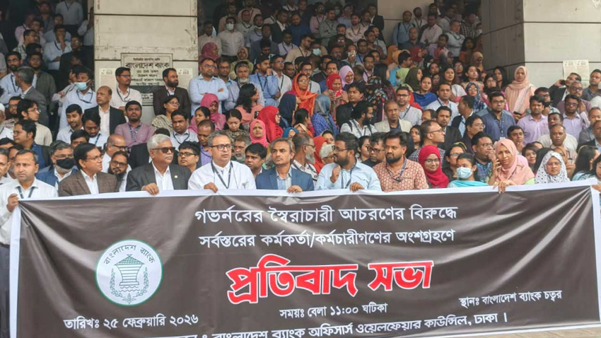 বুধবার (২৫ ফেব্রুয়ারি) বাংলাদেশ ব্যাংকের গভর্নর ড. আহসান এইচ মনসুরের স্বৈরাচারী আচরণের বিরুদ্ধে সংস্থাটির কর্মকর্তা-কর্মচারীদের প্রতিবাদ সভা অনুষ্ঠিত হয়েছে।