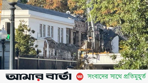 সোমবার ইস্ট উইংয়ের একটি ঢেকে দেওয়া প্রবেশপথ এবং জানালার বিশাল অংশ ভেঙে ফেলেন নির্মাণকর্মীরা, যেখানে ‘সম্পূর্ণ আধুনিকীকরণ’ করা হবে বলে জানিয়েছিলেন ট্রাম্প।