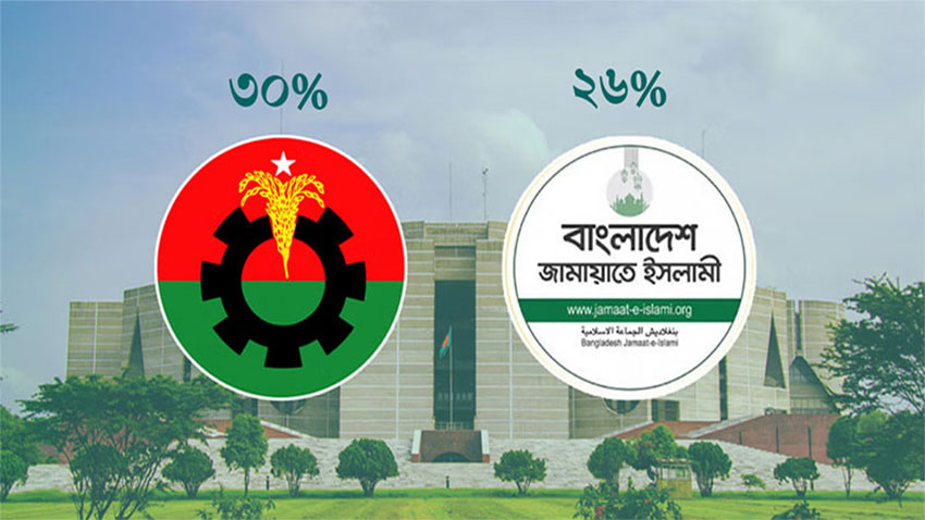 আগামী সপ্তাহে জাতীয় সংসদ নির্বাচন অনুষ্ঠিত হলে ৩০ শতাংশ ভোটার বাংলাদেশ জাতীয়তাবাদী দল-বিএনপিকে ভোট দেবেন। জামায়াতে ইসলামীকে ভোট দেবেন ২৬ শতাংশ ভোটার। অর্থাৎ দুই দলের মধ্যে ব্যবধান মাত্র ৪ শতাংশ। মার্কিন ফেডারেল সরকারের অর্থায়নে রিপাবলিকান পার্টি-ঘনিষ্ঠ অলাভজনক প্রতিষ্ঠান ইন্টারন্যাশনাল রিপাবলিকান ইনস্টিটিউটের (আইআরআই) এক জরিপের ভিত্তিতে এই তথ্য জানিয়েছে।