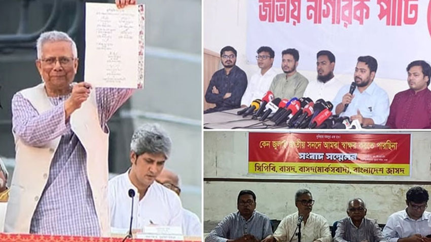 এদিকে, জুলাই সনদ সংশোধন করা না হলে এতে স্বাক্ষর না করার কথা জানায় বাম ধারার চারটি দল। এই সিদ্ধান্ত জানাতে বৃহস্পতিবার বিকেলে সংবাদ সম্মেলন করেন দলগুলোর নেতারা। সেখানে জানানো হয়, জুলাই জাতীয় সনদের স্বাক্ষর অনুষ্ঠানের আগে সংশোধিত খসড়া না পেলে সনদে সই করবে না বাম ধারার চারটি দল।