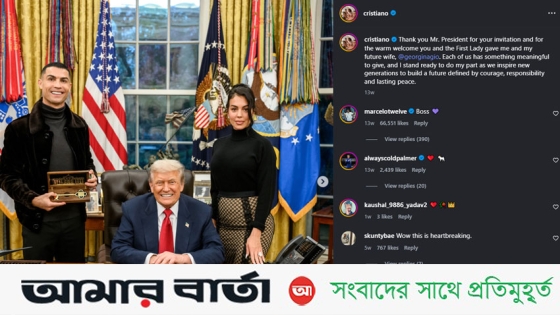 এর আগে নভেম্বরে হোয়াইট হাউজে ট্রাম্পের সঙ্গে সাক্ষাতের কথা ইনস্টাগ্রাম পোস্টে জানান রোনালদো। সেখানে বান্ধবী জর্জিনা রদ্রিগেজ ও মার্কিন প্রেসিডেন্টের সঙ্গে বেশ হাস্যজ্জ্বল মুহূর্তের ছবি যুক্ত করেন তিনি। ওই পোস্টে রোনালদো লেখেন, ‘আমি এবং আমার বাগদত্তা জর্জিনাকে উষ্ণ অভ্যর্থনা জানানোর জন্য ফার্স্ট লেডি (মেলানিয়া ট্রাম্প) এবং আপনাকে ধন্যবাদ মিস্টার প্রেসিডেন্ট। আমাদের প্রত্যেকেই অর্থবহ কিছু দিতে পারি এবং আমি নতুন প্রজন্মকে উৎসাহিত করার প্রক্রিয়ায় অংশ হতে প্রস্তুত, যারা সাহস, দায়িত্বশীলতা ও দীর্ঘমেয়াদী শান্তি প্রতিষ্ঠা করবে।’