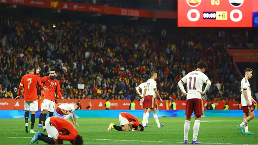 গতকাল (মঙ্গলবার) রাতে মার্চ উইন্ডোর সর্বশেষ প্রীতি ম্যাচে মিশরকে আতিথ্য দেয় স্পেন। পুরো ম্যাচে কেউ গোলের দেখা পায়নি। যদিও ৮৪ মিনিটে মিশরীয় মিডফিল্ডার হামদি ফাতহি লাল কার্ড দেখায় তারা ১০ জনের দলে পরিণত হয়। তবুও সেই সুবিধা কাজে লাগিয়ে ডেডলক ভাঙতে পারেনি লা ফুয়েন্তের দল। এর আগে প্রথমার্ধে মুসলিম বিরোধী শোরগোল তুলতে শোনা যায় স্প্যানিশ সমর্থকদের।